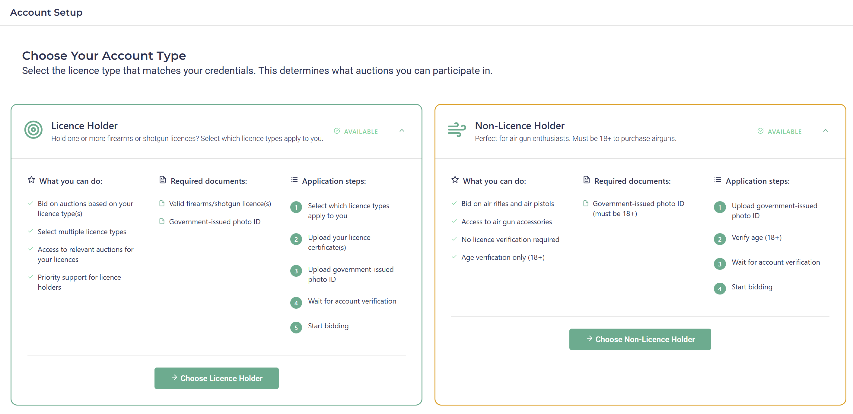 Safety is our top priority. To participate in auctions, you must verify your identity and your legal standing. Because the law requires you to be 18+ to purchase any firearm or airgun, we require a scan of your identification. Furthermore, if you are bidding on Section 1 or Section 2 firearms, you must submit your valid Firearm Certificate (FAC) or Shotgun Certificate (SGC).